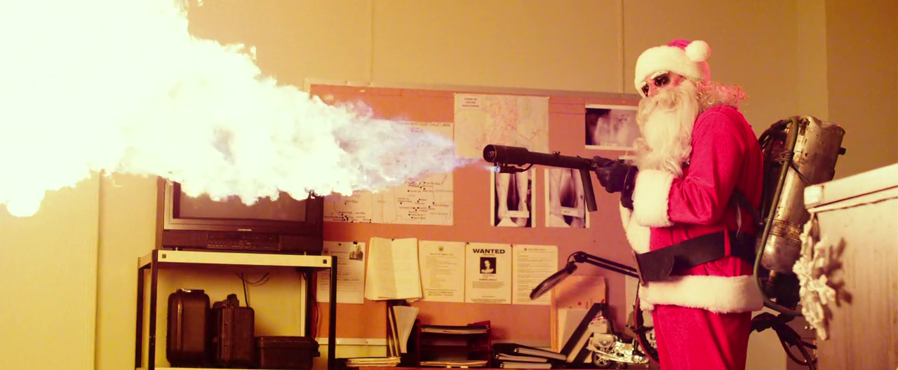 Another town Santa reveals a little backstory regarding another Santa from the town’s past – one who went berserk with a flame thrower. And, thus, it is revealed that our current killer Santa is the son of the previous killer Santa.